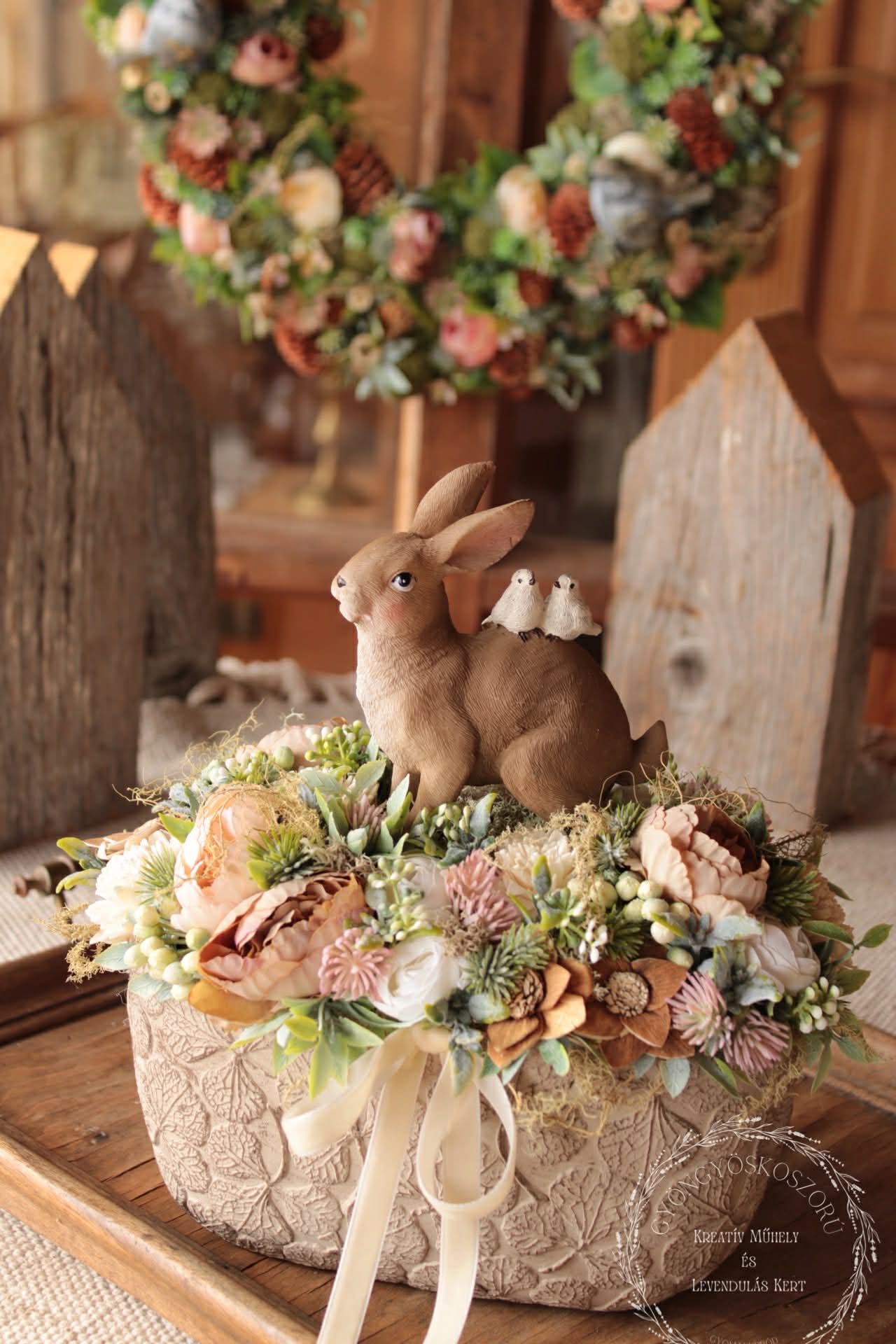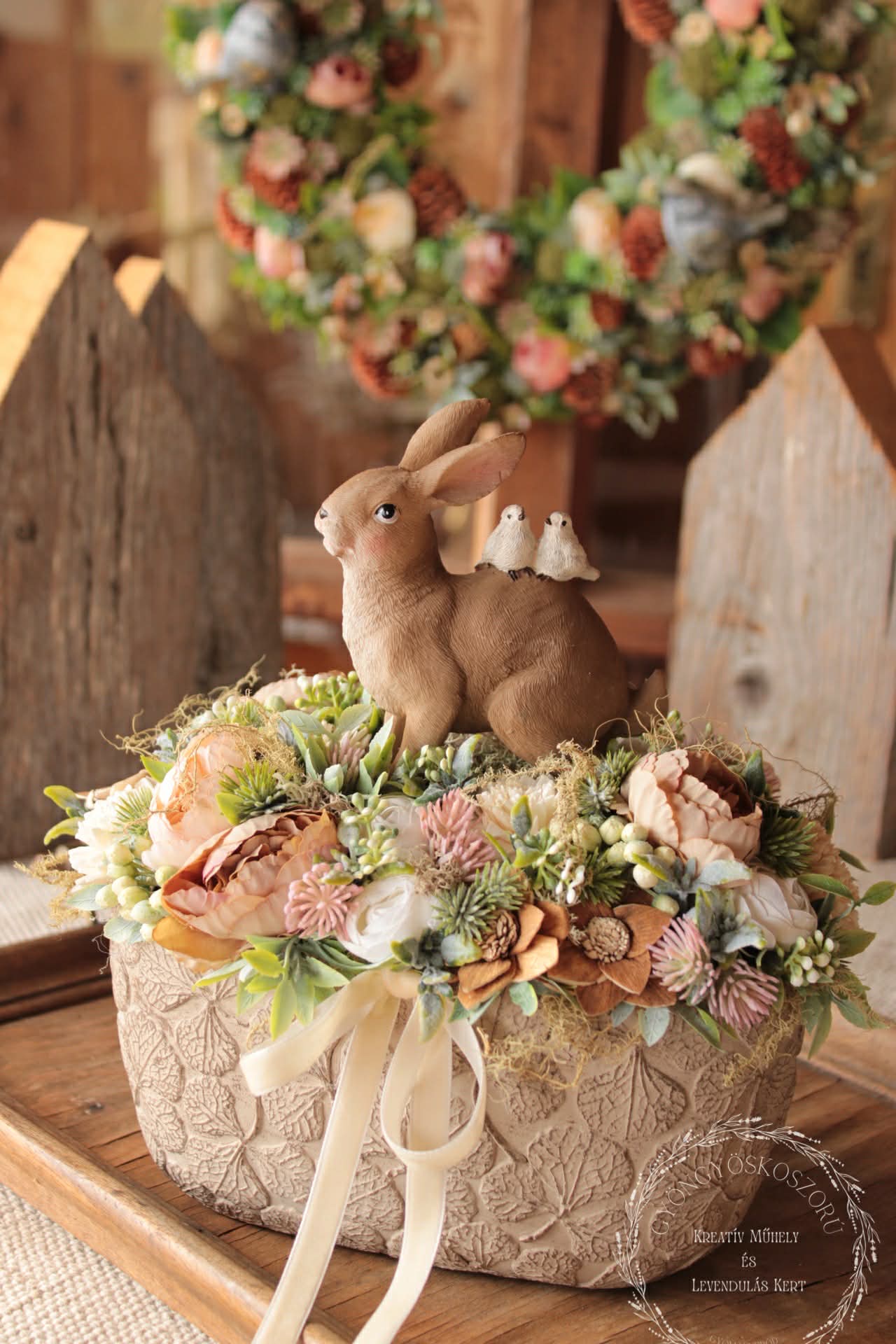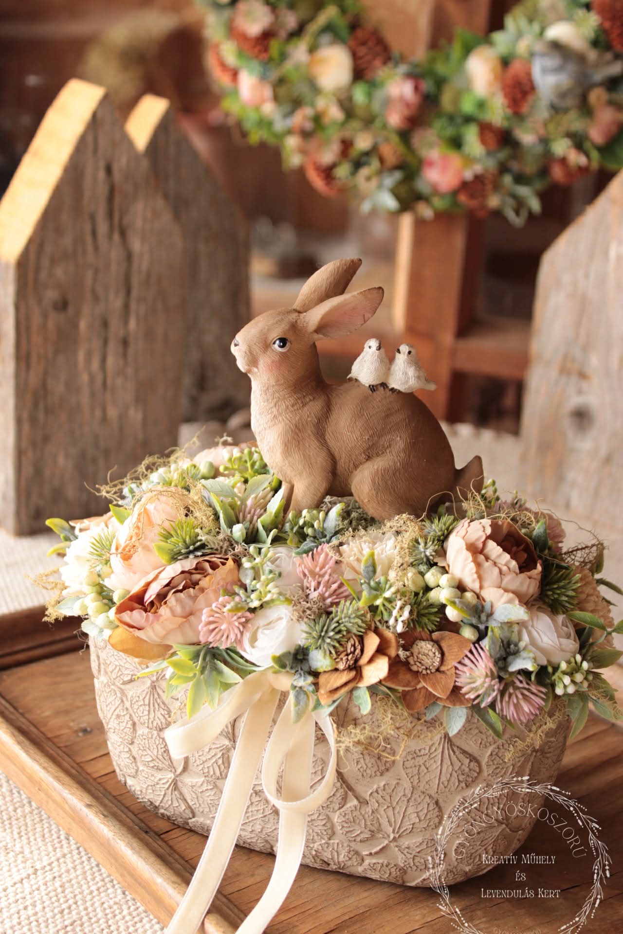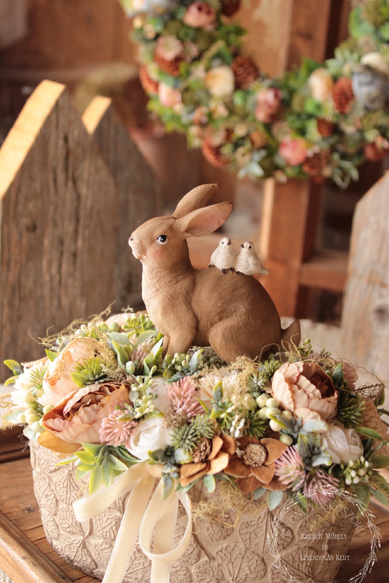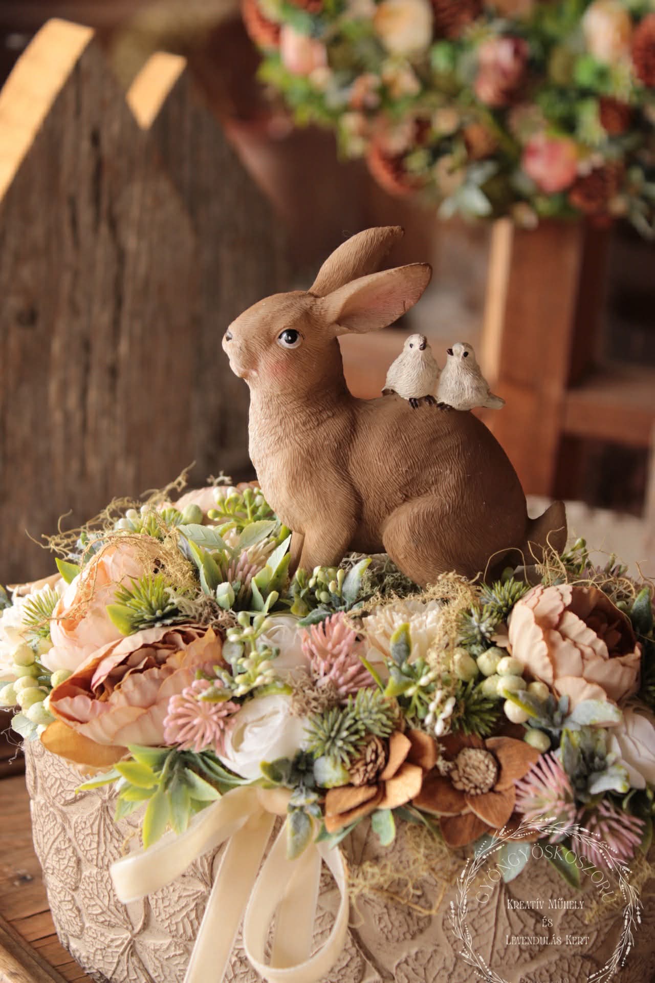 A drapp, fehér és lágy rózsaszín virágok harmonikus kompozíciót alkotnak a hamvas zöld levelekkel, melyek könnyedséget és frissességet adnak az összhatásnak. A barna nyuszi kedves, mégis visszafogott központi elemként bújik meg a virágok között, otthonos, meghitt hangulatot teremtve.